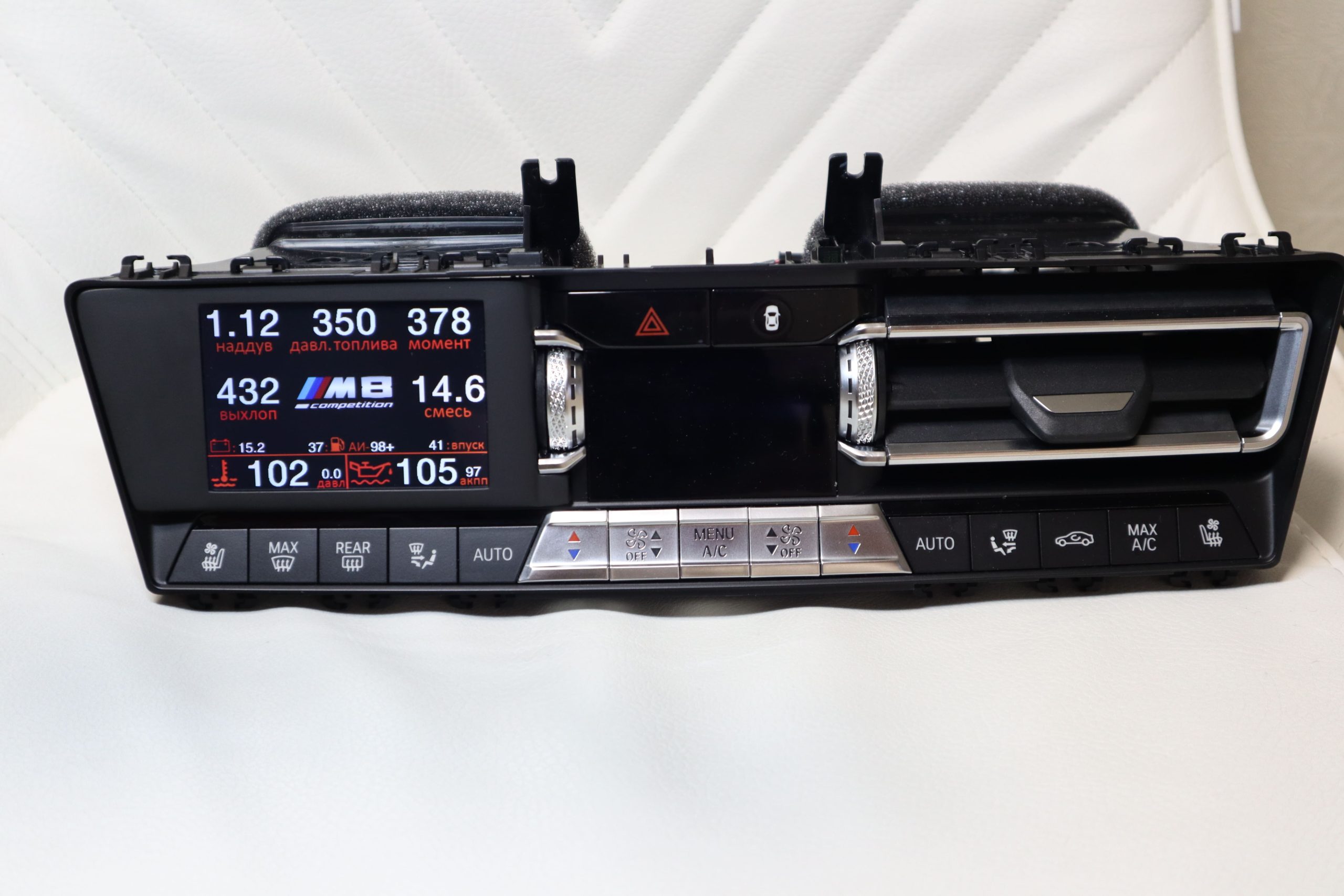 This BMW M8 vent gauge display installs directly into the factory air vent and turns it into a powerful BMW ECU monitor, boost gauge and performance display.